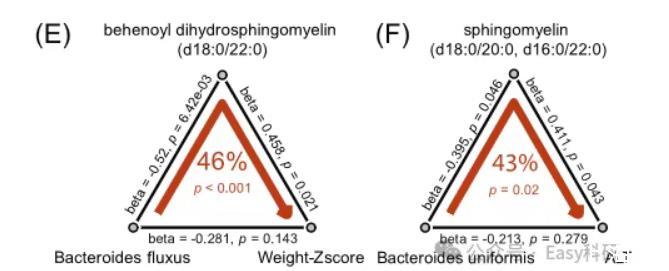 “隨后,中介分析表明,Bacteroides fluxus可能通過影響血清中behenoyl dihydrosphingomyelin(d18:0/22:0)的水平來促進體重減輕(46%,p<0.001);Bacteroides uniformis可能通過降低sphingomyelin水平(d18:0/20:0,d16:0/22:0)(43%,p=0.02),起到減輕肝損傷的保護作用(圖4E,F(xiàn))。這些結(jié)果有力地支持擬桿菌通過調(diào)節(jié)宿主微生物群鞘脂代謝的穩(wěn)態(tài)對MASLD的保護作用?!?