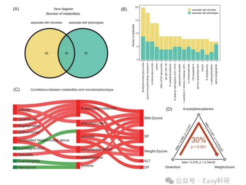 “在MetOrigin 2.0中,使用中介分析來揭示腸道菌群改變與疾病發(fā)生之間的復雜聯(lián)系,代謝產(chǎn)物作為中介物。這種分析增強了我們對微生物群對宿主致病因素反應的適應性和反饋機制的理解。中介分析模塊從對微生物組、代謝組數(shù)據(jù)和表型參數(shù)的Spearman相關(guān)性分析開始(圖3A,B)。在Sankey網(wǎng)絡(luò)中鑒定和可視化與微生物組和表型參數(shù)相關(guān)的代謝物(圖3C)。在Sankey網(wǎng)絡(luò)的指導下,用戶隨后可以通過中介分析選擇感興趣的特定代謝物進行進一步驗證,揭示關(guān)于腸道微生物組在人類健康或疾病發(fā)病中作用的功能見解和潛在因果關(guān)系(圖3D)?!?