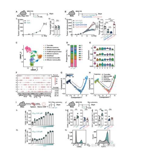 本研究深入探討了3-oxo-D4,6-LCA在抗腫瘤免疫中的作用機制,發(fā)現(xiàn)其通過AR依賴途徑促進具有干細胞樣特性的腫瘤浸潤性CD8+T細胞(Tscm-like)的分化與維持。實驗表明,該BA并不直接抑制MB49腫瘤細胞生長,而是依賴宿主免疫系統(tǒng)發(fā)揮作用,在缺乏B/T細胞的Rag1敲除小鼠中失去了抗腫瘤效果。進一步分析顯示,CD8+T細胞是介導其抗癌效應的關鍵細胞類型。通過對腫瘤微環(huán)境中CD8+T細胞進行單細胞RNA測序,研究人員發(fā)現(xiàn)3-oxo-D4,6-LCA顯著富集了表達Tcf7、Sell和Bcl2等干性相關基因的干細胞樣記憶T細胞亞群(cluster 1),并且這些細胞表達較高的AR水平,提示其對BA的響應可能與AR信號通路密切相關。軌跡分析揭示,該BA可誘導CD8+T細胞從干細胞樣狀態(tài)向效應細胞逐步分化。體外實驗也證實,3-oxo-D4,6-LCA以劑量依賴方式促進初始CD8+T細胞向干細胞樣表型分化。在體內模型中,該BA處理的小鼠腫瘤微環(huán)境中干細胞樣CD8+T細胞比例顯著增加,且這一效應在雄激素剝奪治療(ADT)后被消除,驗證了其AR依賴性。此外,在Pmel-1黑色素瘤模型中,該BA還增強了過繼轉移的腫瘤特異性CD8+T細胞的療效,并提升其干性特征。綜上,3-oxo-D4,6-LCA通過調控CD8+T細胞內在狀態(tài),促進抗腫瘤免疫應答。