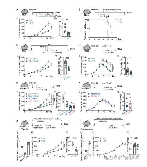 本研究評估了微生物群衍生的膽汁酸3-oxo-D4,6-LCA在體內的抗腫瘤作用及其與免疫檢查點治療的協(xié)同效應。研究發(fā)現(xiàn),該BA通過拮抗雄激素受體(AR)顯著抑制MB49荷瘤小鼠的腫瘤生長和轉移,并提高整體生存率,其腫瘤抑制效果在很大程度上不依賴于腸道微生物。此外,3-oxo-D4,6-LCA還能增強抗PD-1免疫治療的效果。進一步實驗表明,在接受雄激素剝奪治療(ADT)的小鼠中,該BA的抗腫瘤及免疫增強作用被消除,而在補充生理劑量睪酮的ADT小鼠中則恢復,說明其作用機制依賴于AR信號通路。藥代動力學分析顯示,該化合物在血清和腫瘤間質液中的濃度分別為約8μM和9μM,且未引起明顯的肝毒性或膽汁酸譜紊亂。這些結果揭示了3-oxo-D4,6-LCA通過AR依賴機制發(fā)揮抗腫瘤和免疫調節(jié)功能。