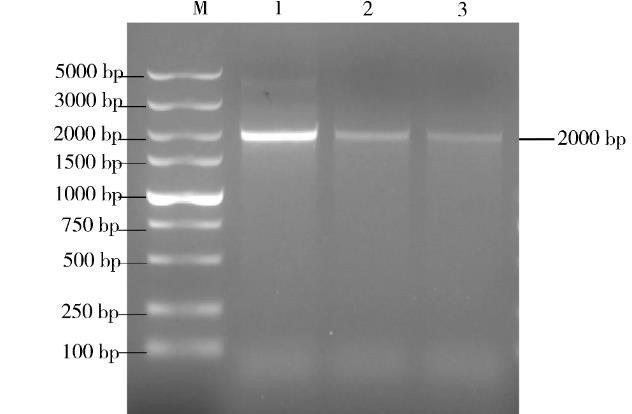 2.2.2重組病毒的鑒定用鑒定引物ORFC17F/ORFC17R對重組病毒進行PCR擴增鑒定,得到大小約為2000 bp的片段(圖3),與理論值相符。