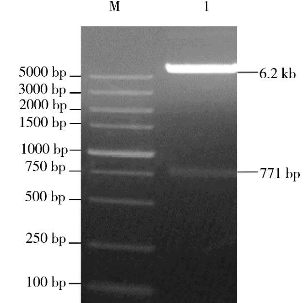 2.1重組質(zhì)粒pT-UL2-RFP的酶切鑒定重組質(zhì)粒pT-UL2-RFP用限制性內(nèi)切酶NheI-HF以及BamH I-HF雙酶切鑒定,得到大小約為6.2 kb和771 bp的兩個片段(圖1),符合理論值。