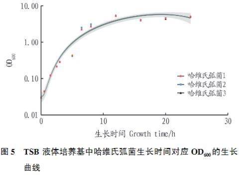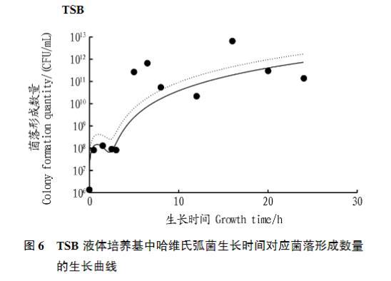 上述公式R2均大于0.4,表明哈維氏弧菌S1的OD600、菌落形成數(shù)量與培養(yǎng)時(shí)間具有相關(guān)性,但公式中哈維氏弧菌S1的菌落形成數(shù)量與培養(yǎng)時(shí)間的關(guān)系表達(dá)式R2lt;0.99,不足以作為直接計(jì)算公式預(yù)測哈維氏弧菌S1菌落形成數(shù)量數(shù)值,而哈維氏弧菌S1的OD600與培養(yǎng)時(shí)間的關(guān)系表達(dá)式R2gt;0.99,具有預(yù)測意義。