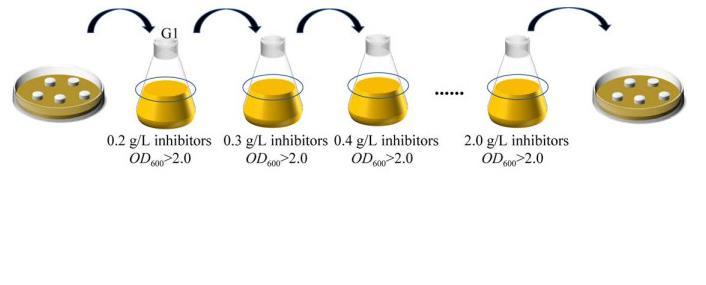 從YPD平板挑取生長(zhǎng)較好的初代單菌落于YPD活化培養(yǎng)基中,在30℃、200 r/min下培養(yǎng)過(guò)夜,取1 mL的菌液4℃、5 000×g離心5 min收集細(xì)胞,用無(wú)菌水重懸,最終以初始OD600=0.2接種于抑制物濃度為0.2 g/L的馴化培養(yǎng)基中,在30℃、200 r/min下培養(yǎng)24?48 h,使得酵母細(xì)胞OD600值達(dá)到2.0?3.0左右(即進(jìn)入穩(wěn)定期),重復(fù)上述步驟2?3次,直至酵母細(xì)胞在當(dāng)前濃度的抑制物脅迫下生長(zhǎng)速度顯著提高;接著,以相同的初始OD600值再次接種至抑制物濃度為0.4 g/L的馴化培養(yǎng)基中,培養(yǎng)至細(xì)胞達(dá)到穩(wěn)定期,在此濃度下重復(fù)培養(yǎng)2?3次,以此類(lèi)推,直至完成所有濃度批次的馴化。馴化結(jié)束后取菌液劃線YPD平板培養(yǎng),挑取生長(zhǎng)良好的單菌落作為最終的進(jìn)化菌株,接種至YPD活化培養(yǎng)基中振蕩培養(yǎng)12?16 h備用,并甘油保存于?80℃。不同抑制物的濃度都是以0.2、0.4、0.6、0.8、1.0、1.2、1.4、1.6、1.8、2.0 g/L梯度提高。