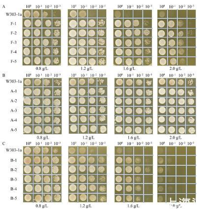 為了測(cè)試釀酒酵母W303-1A中經(jīng)過(guò)一段時(shí)間馴化后是否能促進(jìn)糠醛和對(duì)羥基苯甲酸脅迫下的生長(zhǎng)性能,比較了經(jīng)糠醛馴化后生長(zhǎng)較好的5株菌(即F-1、F-2、F-3、F-4、F-5)和對(duì)照菌株(W303-1A)在含有不同糠醛濃度培養(yǎng)基中的有氧生長(zhǎng)活性(圖2A)。馴化后5株菌在糠醛為0.8 g/L的YPD板上能夠較好地生長(zhǎng),而原始菌株在0.8 g/L糠醛的YPD培養(yǎng)基上生長(zhǎng)相對(duì)較弱。原始菌株在1.2 g/L糠醛的YPD培養(yǎng)基上也能夠存活,但生長(zhǎng)速度遠(yuǎn)慢于馴化后的菌株。馴化后的5株菌在含有1.6 g/L糠醛的YPD的培養(yǎng)基中也可以較好地生長(zhǎng),而未經(jīng)馴化的原始菌株則無(wú)法生長(zhǎng)。當(dāng)培養(yǎng)基中糠醛的濃度提升至2.0 g/L時(shí),馴化的菌株中F-2的生長(zhǎng)速度明顯高于其他4株馴化菌株,以上結(jié)果表明,馴化后的菌株對(duì)糠醛產(chǎn)生了一定的耐受性,其中,F(xiàn)-2菌株的耐受性最好。