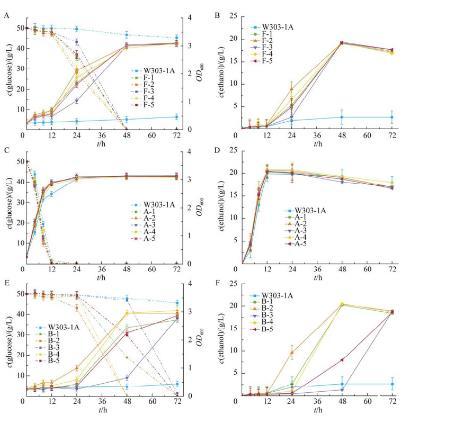 為了更好地評價馴化后酵母菌株對抑制物的耐受性影響,對含有不同濃度抑制物的葡萄糖發(fā)酵液中原始酵母菌株和馴化菌株的乙醇發(fā)酵性能進行了研究。在釀酒酵母的親本菌株培養(yǎng)中,添加2.0 g/L糠醛可以顯著抑制細(xì)胞生長,培養(yǎng)基中葡萄糖的含量幾乎未被消耗。與W303-1A相比,馴化后的5株菌在48 h內(nèi)達到穩(wěn)定,具有通常觀察到的滯后期,并完全消耗葡萄糖(50 g/L),表明馴化后的菌株已經(jīng)適應(yīng)了糠醛環(huán)境。在相同的糠醛脅迫條件下,F(xiàn)-2菌株的生長明顯優(yōu)于其他馴化菌株,發(fā)酵24 h時,F(xiàn)-2菌株乙醇產(chǎn)量為8.96 g/L,比其他4株馴化菌株高2.43?6.29 g/L(圖3A、3B),這一結(jié)果與之前的梯度稀釋實驗結(jié)果一致。隨著發(fā)酵時間的延長,馴化后的5株菌最終的乙醇濃度幾乎相同,而出發(fā)菌株W303-1A最終的乙醇濃度約為2.66 g/L,遠(yuǎn)低于馴化后菌株的發(fā)酵效率。馴化菌株在培養(yǎng)基中消耗了幾乎所有的葡萄糖,最大乙醇濃度為19.40 g/L,葡萄糖轉(zhuǎn)化率為94.4%。以上結(jié)果表明馴化菌株具有較高的糠醛耐受性,乙醇產(chǎn)量比出發(fā)菌株高2倍。Li等將釀酒酵母菌株E7在復(fù)合抑制劑中馴化,獲得進化菌株E7403在36 h即可消耗培養(yǎng)基中全部葡萄糖(50 g/L),最終的乙醇產(chǎn)量也比原始菌株E7多了22.9%。Liu等利用進化工程獲得了一株對糠醛和5-羥甲基糠醛(5-hydroxymethylfurfural,HMF)耐受的菌株,其在20 mmol/L的糠醛和HMF的存在下,48 h葡萄糖被完全消耗且乙醇產(chǎn)量正常,相比之下,原始菌株的細(xì)胞生長則完全被抑制,未產(chǎn)生顯著的乙醇。這一結(jié)果與本研究觀察到的現(xiàn)象相似。