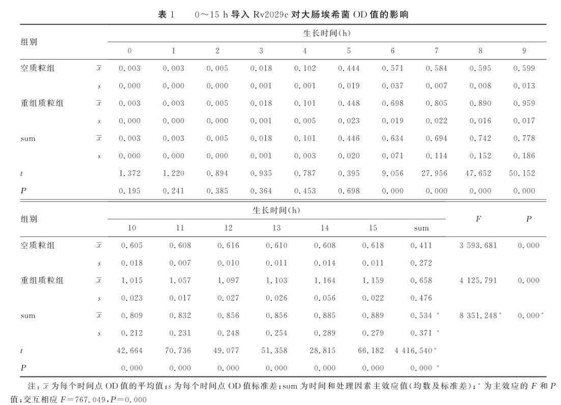 表1 0~15 h導(dǎo)入Rv2029c對大腸埃希菌OD值的影響