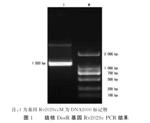 以提取的結(jié)核基因組為模板,在設(shè)計好的引物作用下,行PCR擴增。PCR成功擴出Rv2029c DNA,大小1 020 bp。見圖1。