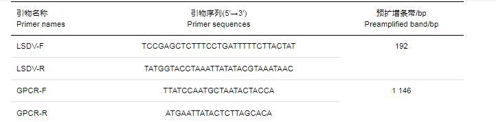 采集黑龍江、吉林和江西三省的疑似LSDV感染牛皮膚結(jié)節(jié)組織樣品,剪碎后加入適量無菌PBS溶液勻漿混勻,制成約10%組織勻漿,雙抗4℃作用7 h并反復(fù)凍融3次,5 000 g離心10 min后棄沉淀,取上清液用0.45μm過濾器過濾,收集濾液置于-80℃冰箱,用于后續(xù)試驗(yàn)。