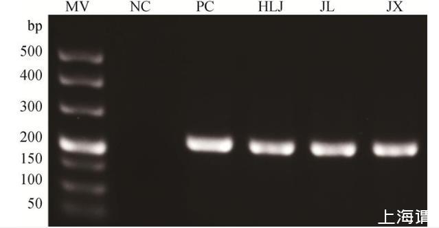 MV.DL500 DNA相對分子質(zhì)量標(biāo)準(zhǔn);NC.陰性對照;PC.陽性對照;HLJ.Heilongjiang/2022株待檢樣本;JL.Jiling/2022株待檢樣本;JX.Jiangxi/2022株待檢樣本