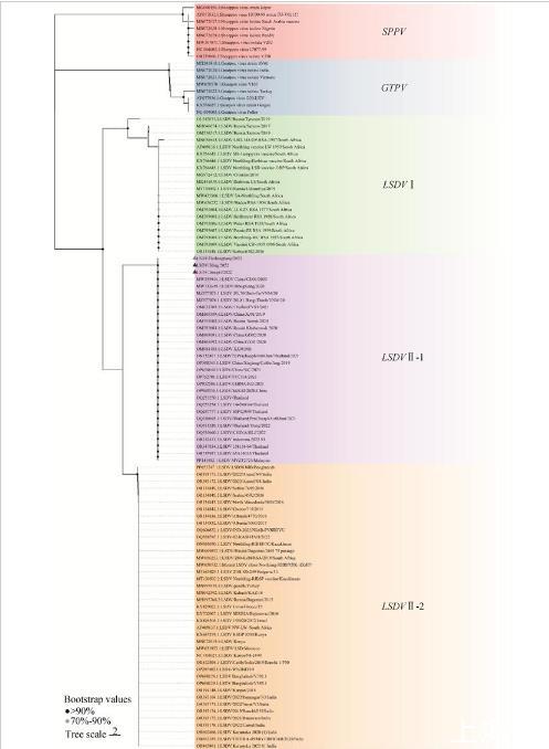 由圖5可知,通過GPCR基因遺傳進化分析可以將LSDV與GTPV、SPPV區(qū)分。LSDV被分為3個明顯不同的分支,LSDVⅠ包含多個疫苗毒株以及類疫苗樣毒株,親緣關系更近的LSDVⅡ-1與LSDVⅡ-2更多的為各地自然感染的分離毒株。所有中國毒株均被分類為LSDVⅡ-1亞群,這一亞群中已有多株病毒被確認為重組病毒,值得注意的是我國分離毒株與越南、泰國毒株處于同一分支,且俄羅斯2020年以后的分離毒株也處于這一分支,提示這些毒株間有著更相似的病毒起源關系,推測這些毒株源于同一祖先,與印度和南非等地分離毒株親緣關系較遠。