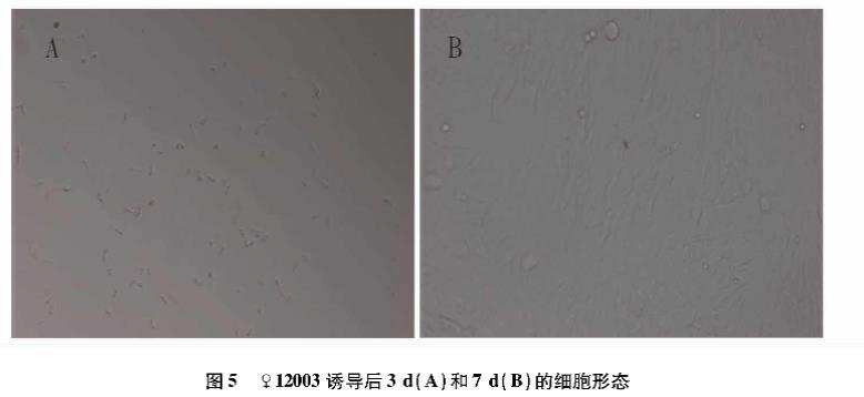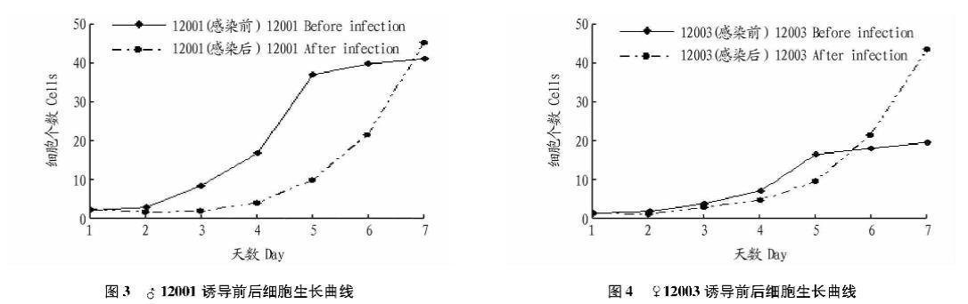 3種細胞接種2 d后數(shù)量明顯增加,第2~5天進入對數(shù)生長期,第5~7天進入平臺期,呈現(xiàn)典型的“潛伏期-對數(shù)生長期-停滯期”生長模式(圖2、3、4)。而感染后的3種體細胞在感染前3 d,細胞大量凋亡(圖5A)。4~7 d篩選出的細胞大量增殖(圖5B)。