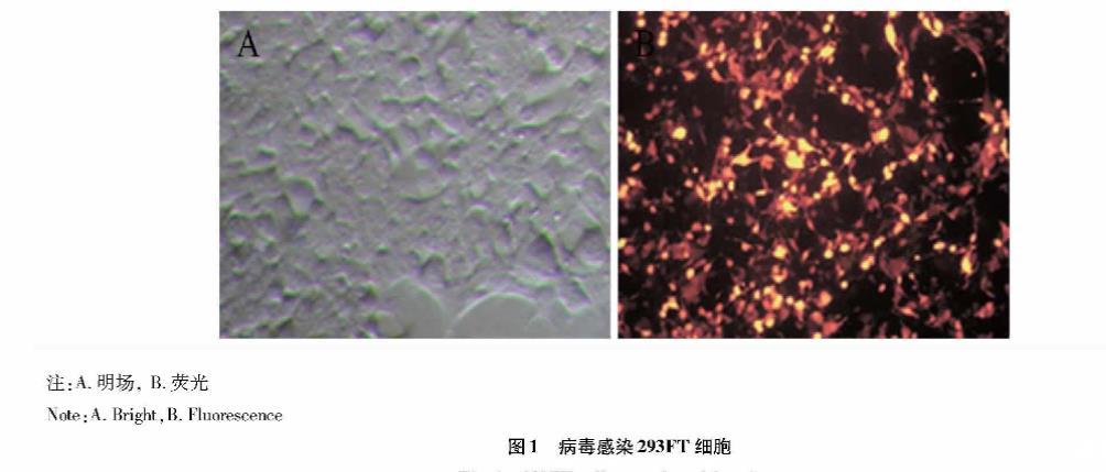 病毒感染40 h后,在熒光顯微鏡下可以觀察到293FT細胞帶有紅色熒光(圖1),說明包裝的病毒質量很好,而且濃縮病毒感染后的293FT細胞的熒光強度要強于病毒原液感染后293FT細胞的熒光強度。