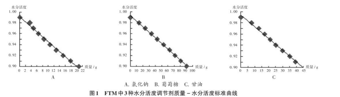 不同水分活度培養(yǎng)基的配制:分別以氯化鈉、葡萄糖及甘油作為水分活度調(diào)節(jié)劑,并測定其滅菌后的水分活度值,制備不同水分活度的FTM。以3種水分活度調(diào)節(jié)劑的質(zhì)量對培養(yǎng)基水分活度值繪制標準曲線。
