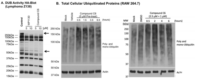 圖2、化合物C6在人類細胞中抑制DUB活性并增加鼠細胞中的全局泛素化。(A)HA印跡顯示W(wǎng)P1130和化合物C6在5μM和10μM濃度下的DUB抑制作用。箭頭指示DUB活性抑制區(qū)域。(B)在鼠RAW 264.7細胞全細胞裂解物中使用抗泛素抗體(多聚和單泛素)進行的Western blot,采用30分鐘5μM預(yù)處理(左)或30分鐘2.5μM然后1.0μM(右)處理指定時間。印跡圖代表三個獨立實驗,結(jié)果相似。