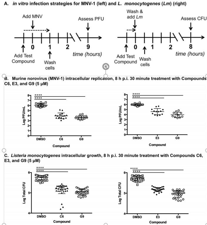 圖1、39種小分子DUB抑制劑中的兩種降低了MNV-1和單核細胞增生李斯特菌在RAW 264.7細胞中的細胞內(nèi)生長,效果與母體化合物G9相似。(A)用于體外感染測試39種小分子化合物對MNV-1(MNV)(左)和單核細胞增生李斯特菌(右)抗感染作用的總體方案。(B和C)使用5μM化合物C6(左)和E3(右)對RAW細胞進行MNV-1。(B)和單核細胞增生李斯特菌(C)細胞培養(yǎng)感染的結(jié)果。還包括使用先前表征的化合物G9的結(jié)果。與載體(DMSO)處理的細胞水平相比,用化合物C6和E3處理導(dǎo)致病毒復(fù)制降低超過2個數(shù)量級,細菌生長減少超過50%(載體處理細胞的結(jié)果與未處理細胞無顯著差異;未顯示)。使用單因素方差分析(ANOVA)和Dunnett事后檢驗比較載體處理組和化合物處理組。