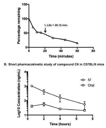 圖5、C57BL/6小鼠肝臟微粒體中化合物C6的代謝穩(wěn)定性和短期藥代動力學研究。(A)化合物C6在小鼠肝臟微粒體中的LC-MS/MS分析。代謝半衰期為20.12分鐘。(B)口服和靜脈注射化合物C6的短期藥代動力學分析(每種情況2只小鼠)。在給藥后0.5、2、4和7小時測量血液中的濃度??诜┝繛?0毫克/千克,靜脈注射劑量為10毫克/千克。