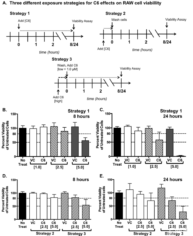 圖4、化合物C6在多種處理條件下對RAW 264.7細胞活力的影響?;衔顲6的濃度和暴露時間導(dǎo)致不同水平的細胞活力。(A)測試C6對RAW細胞活力影響的三種不同策略。策略1,持續(xù)暴露;策略2,僅預(yù)處理;策略3,變化暴露(較高預(yù)處理濃度和持續(xù)較低濃度,模擬感染方案)。虛線代表RAW細胞暴露于C6的時間。(B到E)RAW 264.7細胞的刃天青細胞活力測定。上面板顯示根據(jù)策略1在8小時(B)和24小時(C)孵育后的細胞活力。下面板顯示根據(jù)策略2和3在8小時(D)和24小時(E)后的細胞活力。結(jié)果以未處理細胞在570 nm處的吸光度百分比(活力百分比)顯示。所示濃度為微摩爾。VC,載體對照。載體對照實驗使用與C6處理組最高濃度體積相匹配的DMSO體積。