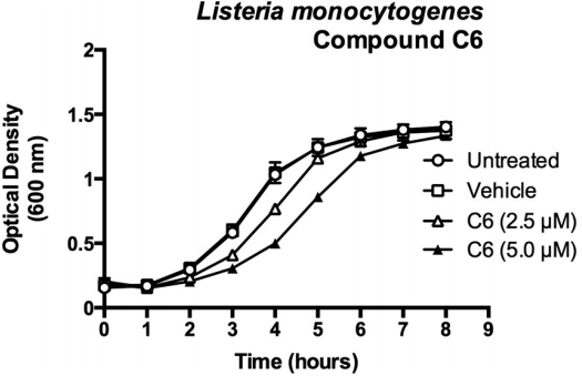 圖3、單核細胞增生李斯特菌在化合物C6存在下的生長曲線?;衔顲6對BHI肉湯培養(yǎng)物中單核細胞增生李斯特菌104035的體外生長產(chǎn)生劑量依賴性效應(yīng)。該圖繪制了兩次獨立實驗中每種條件的三個重復(fù)樣本的平均值,誤差棒代表標準差。
