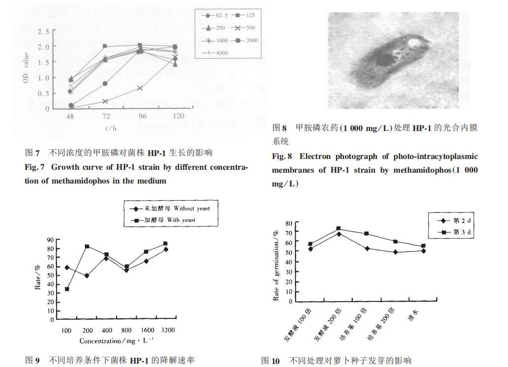在有無酵母存在的情況下,菌株HP-1在甲胺磷濃度0~800mg/L之間,生長速度基本無差異;但是隨著濃度提高,加酵母的比未加酵母的生長速度快1~2d。另外,培養(yǎng)10d后取樣分析,其相應濃度條件下,菌株的降解速率加酵母的明顯高于未加酵母的(圖9),低濃度時加入酵母不利于菌株對農藥的降解,出現未加酵母的比加酵母的降解率高。在耐受范圍內均隨著濃度的增加,其降解率也隨著增加,微生物對農藥降解由于受到許多因素的影響,其降解率也出現波動。