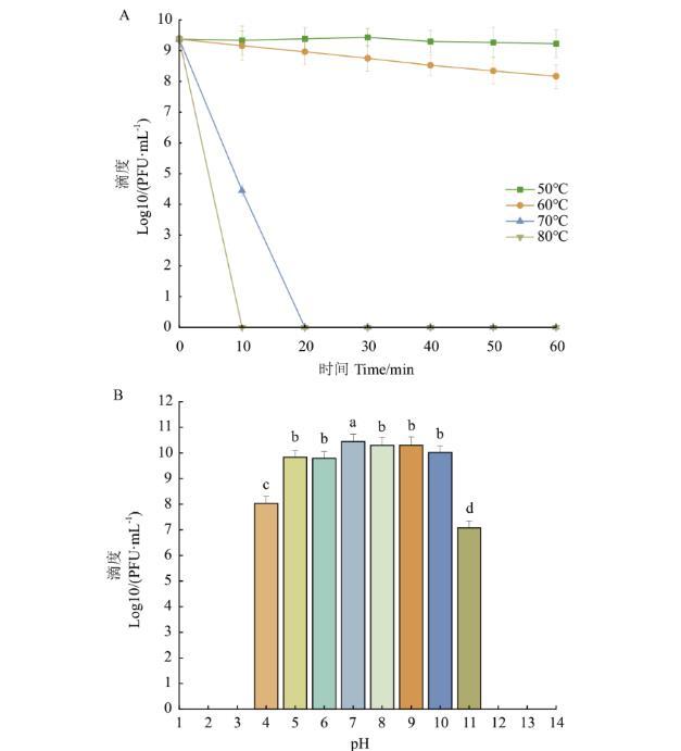 (2)噬菌體pH穩(wěn)定性。取1 mL的噬菌體液加入9 mL不同pH(1-14)的營養(yǎng)肉湯中,37℃恒溫培養(yǎng)1 h,取出后進行倍比稀釋,用上文的方法測定噬菌體滴度,重復3次。