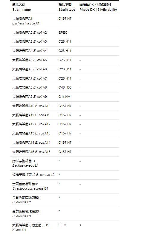 將實驗室保存的其他15株大腸埃希菌,2株蠟樣芽孢桿菌,3株金黃色葡萄球菌全部復蘇并培養(yǎng)至對數期,用噬菌體DK-13進行裂解測定,結果顯示噬菌體DK-13不能裂解以上任何細菌,只能裂解宿主菌EIEC。說明噬菌體DK-13的特異性非常強。詳細結果見表1。