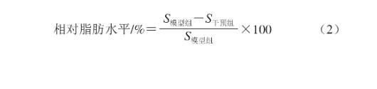 孵育結(jié)束后使用E3養(yǎng)殖水沖洗幼魚,將幼魚收集于1.5 mL離心管中,加入1 mL 4%多聚甲醛溶液,4 ℃固定1 d。將離心管中固定的幼魚倒入24 孔板中,E3養(yǎng)殖水沖洗2 次,用不同體積分數(shù)的1,2-丙二醇溶液按以下順序進行滲透:25% 1,2-丙二醇溶液處理25 min→50%1,2-丙二醇溶液處理25 min→75% 1,2-丙二醇溶液處理25 min→100% 1,2-丙二醇溶液處理25 min。加入質(zhì)量分數(shù)為0.5%油紅O染液2 mL(幼魚完全浸沒),錫紙避光,室溫染色過夜。洗掉染液,加入體積分數(shù)為100% 1,2-丙二醇溶液,去背景色20 min(在顯微鏡下觀察去背景的效果)。在顯微鏡下拍照觀察斑馬魚幼魚染色情況(脂肪細胞和肝臟脂肪變性染色呈紅色)。采用ImageJ 6.0軟件進行圖像分析并采集數(shù)據(jù),分析統(tǒng)計斑馬魚尾部血管血脂光密度總和(S),根據(jù)光密度總和的統(tǒng)計學結(jié)果按式(2)計算相對脂肪水平,以評價動物雙岐桿菌NX-6的降血脂作用。