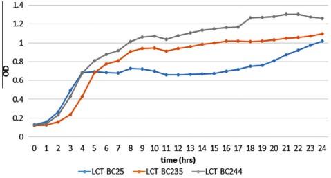 圖1、所研究的三種蠟樣芽孢桿菌菌株的生長(zhǎng)曲線。通過在Bioscreen C中觀察到的生長(zhǎng)曲線比較顯示,兩個(gè)飛行株表現(xiàn)出比對(duì)照LCT-BC244顯著更慢的生長(zhǎng)速率,特別是在5小時(shí)后。