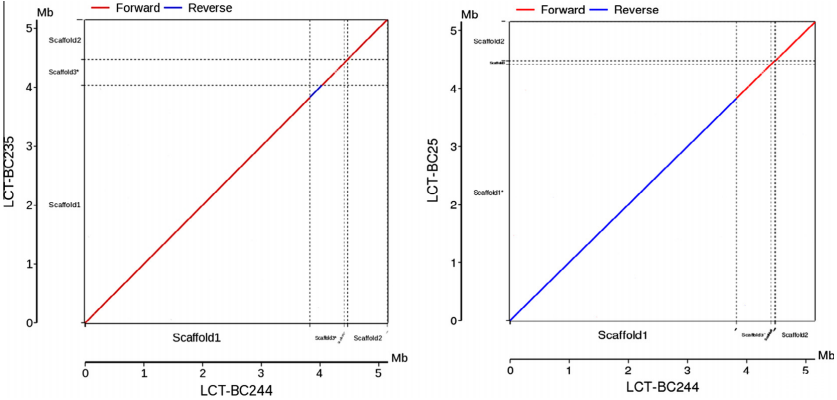 圖2、三種蠟樣芽孢桿菌菌株的全基因組同源性分析。