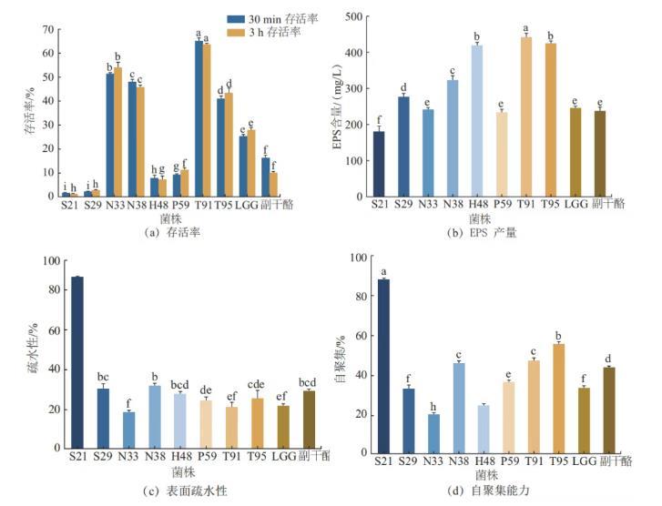 在腸道微生物與宿主間的相互作用中,乳桿菌分泌的胞外多糖(EPS)不僅有助于調(diào)節(jié)腸道菌群平衡,還具有增強(qiáng)免疫力、降低血糖和膽固醇水平等多種益生功能。本試驗(yàn)以LGG和LP_6110為對(duì)照,測定不同菌發(fā)酵上清液中胞外多糖產(chǎn)量。由圖5(b)可見,H48、T91及T95菌株的EPS產(chǎn)量均超過400 mg/L。而S21菌株的EPS產(chǎn)量則相對(duì)較低,僅為179.38 mg/mL(P<0.05)。本研究測定的結(jié)果略高于蔣光陽等篩選得到的來源于谷物醋中的菌株,其EPS產(chǎn)量最高僅為344.45 mg/L。