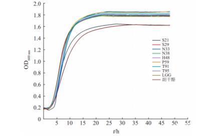 由圖4可見,8株篩選菌與2株對(duì)照菌在MRS培養(yǎng)基中均表現(xiàn)出良好的生長趨勢。N33、H48、P59、T91和T95這5株菌株生長能力最強(qiáng),而S21菌株與對(duì)照菌LP_6110的生長能力相對(duì)較弱,它們的OD600 nm最大值僅為1.638和1.626。綜上所述,可得出8株試驗(yàn)菌株與2株對(duì)照菌株的生長強(qiáng)度排序由強(qiáng)至弱為:N33>P59>T91>T95>H48>N38>S29>LGG>S21>LP_6110。