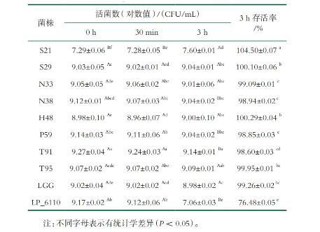 結(jié)果表明,pH 2.5時(shí)8株鼠李糖乳酪桿菌存活率范圍介于98.60%~104.50%之間。菌株S29、H48、T95處理3 h(pH 2.5)后存活率幾乎與初始狀態(tài)持平,表現(xiàn)出極強(qiáng)的穩(wěn)定性。而其他試驗(yàn)菌株的存活率雖有輕微下降,但總體差異并不顯著。8株菌均展現(xiàn)出良好的耐酸能力。對(duì)照LGG耐酸能力與上述8株試驗(yàn)菌株相當(dāng),而LP_6110處理3 h后的存活率僅為76.48%。這種差異性可能歸因于不同種類乳酸菌在耐酸能力上存在固有差異。張迪等研究植物乳植桿菌(Lactiplantibacillus plantarum,Lpb.plantarum)HOM3201和動(dòng)物雙歧桿菌乳亞種(Bifidobacterium animalis subsp.lactis,B.lactis)HOM1119在胃腸液3 h存活率均在100%以下,而本試驗(yàn)的菌株S21和S29高于HOM3201和HOM1119的存活率。