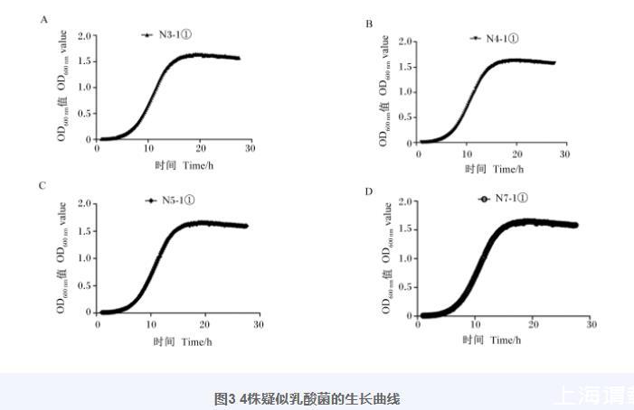 圖3 4株疑似乳酸菌的生長曲線A:N3-1①28 h內(nèi)OD600 nm值變化;B:N4-1①28 h內(nèi)OD600 nm值變化;C:N5-1①28 h內(nèi)OD600 nm值變化;D:N7-1①28 h內(nèi)OD600 nm值變化。