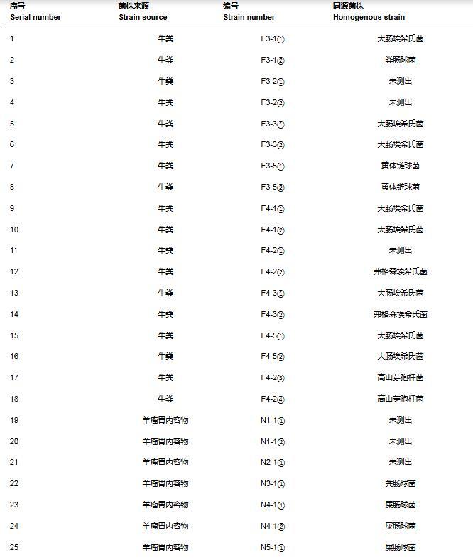 將從牛糞中分離的18株、從羊瘤胃內(nèi)容物中分離的9株和從青貯飼料中分離的2株共29株細(xì)菌的16S rDNA進(jìn)行擴增,擴增產(chǎn)物的電泳圖見圖1。將這29株分離菌株的16S rDNA序列在NCBI數(shù)據(jù)庫進(jìn)行Blast序列比對,選取序列同源性最高的菌株作為測序菌株的疑似菌株,其中有11株疑似乳酸菌(表1)。
