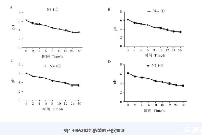 圖4 4株疑似乳酸菌的產(chǎn)酸曲線A:N3-1①36 h內(nèi)pH變化;B:N4-1①36 h內(nèi)pH變化;C:N5-1①36 h內(nèi)pH變化;D:N7-1①36 h內(nèi)pH變化。