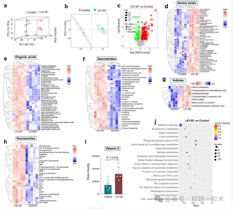 鑒于L01-B1改變了人類腸道微生物群的組成,并且長雙歧桿菌亞種sueorum得到了富集,我們試圖研究潛在的代謝物變化。主坐標分析(PCoA)顯示對照組和L01-B1組完全分離(圖10a)。偏最小二乘判別分析(PLS-DA)也顯示對照組和L01-B1組完全分離(圖10b)。代謝物差異豐度分析顯示,有190種化合物增加,而81種代謝物減少(圖10c)。隨后,我們將這些增加的代謝物進行了分類。結(jié)果顯示,增加的代謝物可以分為6類,包括氨基酸、有機酸、糖類、吲哚、核苷和維生素及其衍生物(圖10d–i)。KEGG分析顯示,差異豐度代謝物主要富集在糖類和氨基酸代謝途徑中。總之,這些結(jié)果突出表明L01-B1可能會改變?nèi)祟惸c道微生物群的代謝物。