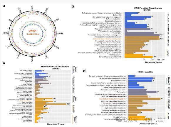 尤為重要的是,我們的分析表明,DK001包含10個碳水化合物結(jié)合模塊(CBMs)、5個碳水化合物酯酶(CEs)、56個糖基水解酶(GHs)和10個糖基轉(zhuǎn)移酶(GTs),這些酶在多糖降解中發(fā)揮重要作用。隨后,我們分別對DK001進行了COG功能分類和KEGG通路分類分析。COG功能分類和KEGG通路分類分析分別鑒定了169個和125個與碳水化合物代謝相關(guān)的富集基因(圖8bc)。