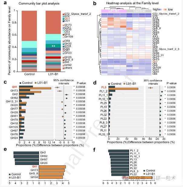圖9.基于宏基因組測序的碳水酶分析。(a)科水平上的群落柱狀圖分析。(b)科水平上的熱圖分析。(c)通過對照組和L01-B1組比較分析糖基水解酶(GHs)。(d)通過對照組和L01-B1組比較分析多糖裂解酶(PLs)。(e)通過LEfSe分析GHs。(f)通過LEfSe分析PLs。數(shù)據(jù)代表技術(shù)重復三次(n=4)。對于兩組之間的比較,采用非配對雙尾學生t檢驗。